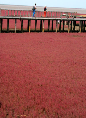 Tourists visit the Red Beach National Reserve in Panjin, Northeast China's Liaoning province, August 15, 2008. [Xinhua