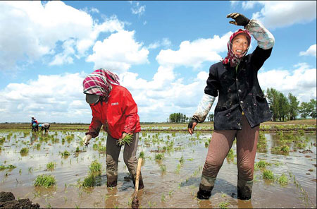 Farmers plant rice seedlings in the photo taken earlier this year in Yushu, Jilin province. The government is working on a plan to boost the country's annual grain output by 10 percent by 2020, an industry expert said yesterday.[China Daily]