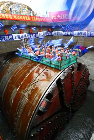 Workers celebrate the completion of the Yangtze River Tunnel in Shanghai, east China, September 5, 2008. [Xinhua]