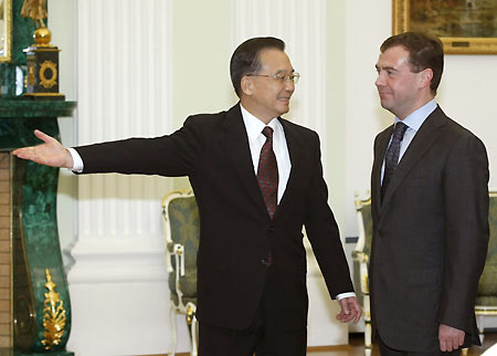 Chinese Premier Wen Jiabao (L) and Russia's President Dmitry Medvedev meet for talks in Moscow October 28, 2008. The two countries Tuesday signed a deal on building a trans-Siberian pipeline that will pump 15 million tons of crude to China each year, according to Global Times. [Agencies]