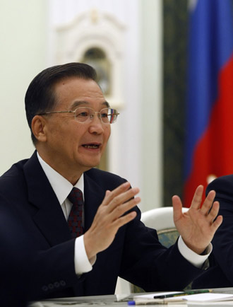Chinese Premier Wen Jiabao speaks during his meeting with Russia's President Dmitry Medvedev in Moscow October 28, 2008. The two countries Tuesday signed a deal on building a trans-Siberian pipeline that will pump 15 million tons of crude to China each year, according to Global Times. [Agencies]