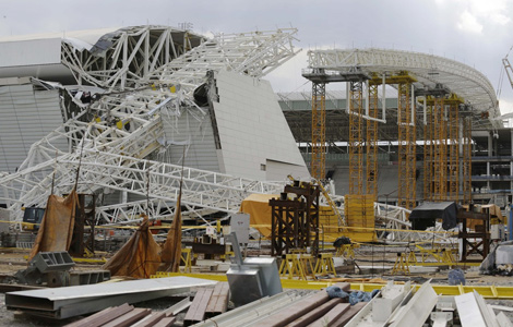 A metal structure that buckled sits on part of the Itaquerao Stadium in Sao Paulo, Brazil, Wednesday, Nov 27, 2013. Part of the stadium that will host the 2014 World Cup opener in Brazil collapsed on Wednesday, causing significant damage and killing three people, authorities said. [Photo/icpress.cn]