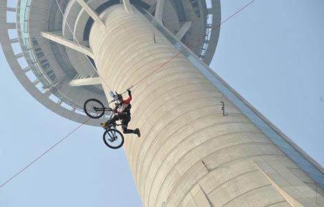 Crazy Jump Day, a bungee campaign themed on sports, is held in Macao, Jan 4, 2014. Competitors are encouraged to do creative jumps in the game from a 233-meter-high tourist tower and 100,000 yuan of the prize will be donated to Macao Red Cross. [Photo/icpress.cn]