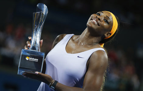 Serena Williams of the US holds up the Brisbane International trophy after defeating Victoria Azarenka in the women's singles final in Brisbane, January 4, 2014.[Photo/Agencies] |