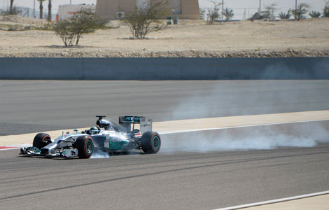 Mercedes F1 driver Nico Rosberg of Germany brakes hard during the second day of Formula One testing at the Bahrain International Circuit in Sakhir, south of Manama Feb 20, 2014. [Photo/Agencies]