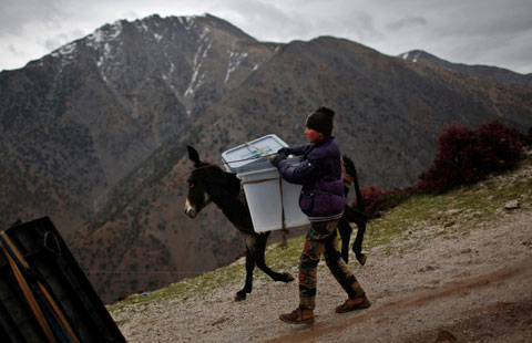 A resident carries her child near a barricade during a demonstration in Iquique, Chile, on April 5, 2014. Residents from Laguna Verde of Iquiqu took part in the demonstration demanding more help for the people affected by the 8.2 magnitude earthquake that affected the north of Chile on April 1. [Photo/Xinhua] |