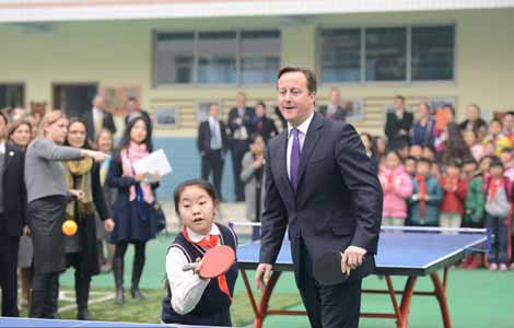 Visiting British Prime Minister David Cameron joins a table tennis game with pupils of Longjianglu Primary School in Chengdu, captital city of Southwest China's Sichuan province December 4, 2013.