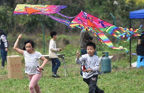 Tourists fly kites in Zhongliang township of southwest China's Chongqing Municipality, March 26, 2016.