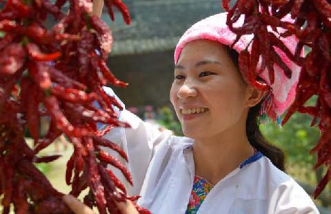 Villagers dry the newly picked peppers at Mahai Village in Longji Township in Guilin city, South China's Guangxi Zhuang autonomous region on Aug 10, 2014.