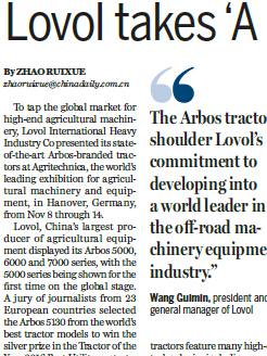 To tap the global market for high-end agricultural machinery, Lovol International Heavy Industry Co presented its stateof-the-art Arbos-branded tractors at Agritechnica, the world's leading exhibition for agricultural machinery and equipment, in Hanover, Germany, from Nov 8 through 14.