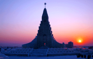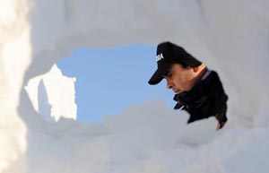 A workman walks near ice sculptures at the 12th Harbin Ice and Snow World display in the northern city of Harbin, Heilongjiang province January 4, 2011. The Harbin International Ice and Snow Festival will be officially launched on January 5.[Photo/Agencies]