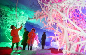 Tourists wander amid ice lanterns at an ice house in Harbin city, Northeast China's Heilongjiang province, June 30, 2011.