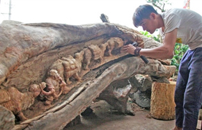 Silk Road scene carved into tree trunk