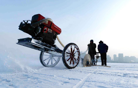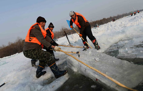 Workers drag a big chunk of ice out of the Songhua River on Saturday in preparation for the annual Harbin International Ice and Snow Festival in the capital of Northeast China's Heilongjiang province. The river ice is about 35 centimeters thick. The festival is expected to open to the public later this month.