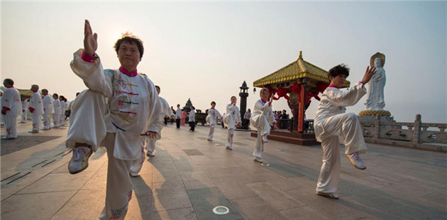 A photo shows hundreds of people practicing tai chi in the early morning on the Nanshan Mountain in Sanya, south China's Hainan Province, on April 9, 2016.
