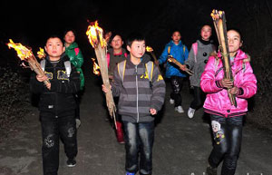 Zhang Huaying's home is located 10 kilometers away from her primary school on the top of a mountain at a height of 200 meters. She gets up at 5 am and spends more than two hours walking to school everyday.