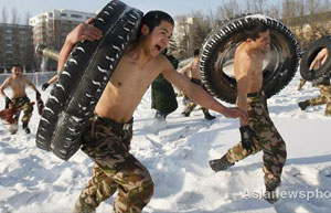 As temperatures drop to -25C, about 700 soldiers of the Changchun fire brigade participate in a physical training program to build cold resistance. The drill is conducted at least twice a week.