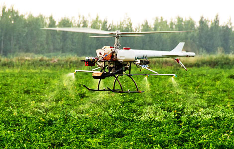 A flying robot monitors the growing condition of the crops over farmlands in Ili, a Kazak autonomous prefecture in Northwest China’s Xinjiang Uygur autonomous region, July 25, 2011.