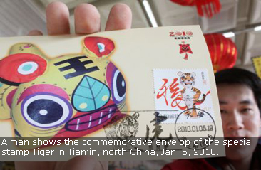 The stamp for 2010, the year of tiger in China's lunar calendar, is launched for public sales nationwide.