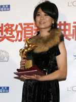 Director Chiang Hsiu-chiung poses with her award for Best Short Film "Hopscotch" at the 45th Golden Horse Awards in Taichung December 6, 2008. |