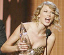 Taylor Swift accepts the award for Album of the Year for "Fearless" with her producer Nathan Chapman at Country Music Association Awards.