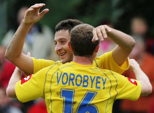 Ukraine beat Lybia 3-0 in friendly (Reuters) Updated: 2006-06-06 11:00  Ukraine's Olexiy Belik (L) and Andriy Vorobei celebrate third