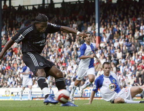 Chelsea's Didier Drogba (L) scores as Blackburn Rovers' Andre Ooijer (R) watches during their English Premier League soccer match at Ewood Park in Blackburn, northern England, August 27, 2006. [Reuters]