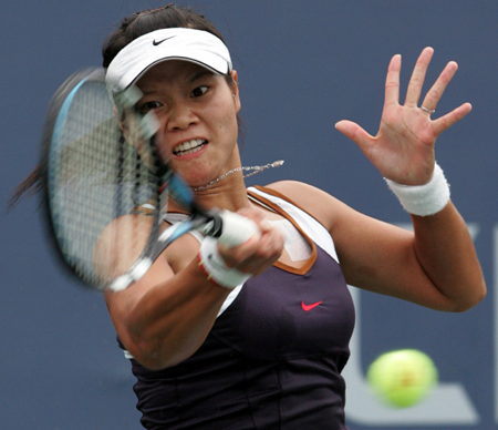China's Li Na plays a shot to Spain's Maria Sanchez Lorenzo during their match at the U.S. Open tennis tournament in New York, August 30, 2006. [Reuters]