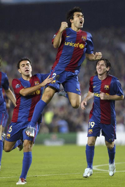 Barcelona's Deco (C), Leo Messi (R) and Xavi celebrate a goal against Chelsea during their Champions League Group A soccer match at Nou Camp Stadium in Barcelona October 31, 2006. [Reuters]