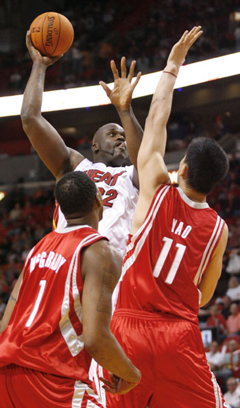 Miami Heat's Shaquille O'Neal goes for the basket over top of Houston Rockets Tracy McGrady (L) and Yao Ming during first quarter NBA basketball action in Miami, Florida November 12, 2006. [Reuters]