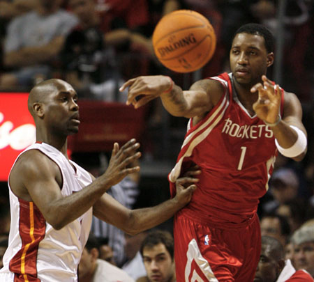 Miami Heat's Gary Payton (L) defends against Houston Rockets Tracy McGrady during first quarter NBA basketball action in Miami, Florida November 12, 2006. [Reuters]
