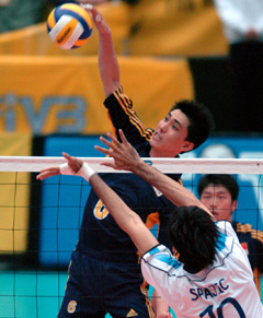 China's Wang Haichuan(front) spikes the ball aganist Argentian volleyball team player during their match at the FIVB men's Volleyball World Championship in Saitama, Japan November 19, 2006.[Xinhua]