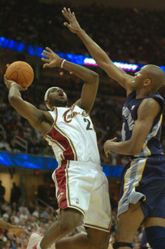 Cavaliers attempts a shot over Stromile Swift of the Memphis Grizzlies in