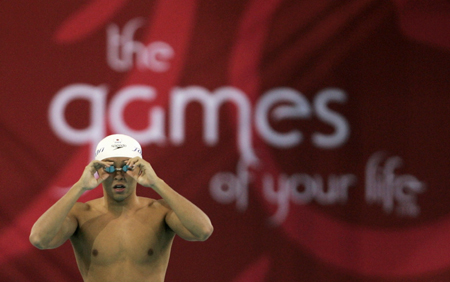 Japan's Kosuke Kitajima adjusts his goggles before the men's 100m breaststroke swimming heats at the 15th Asian Games in Doha December 4, 2006. [Reuters]
