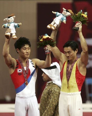 Joint gold medallists Kim Dae Eun of South Korea (L) and Yang Wei of China stand together on the victory podium after the gymnastics men's parallel bars event at the 15th Asian Games in Doha December 6, 2006. [Reuters]