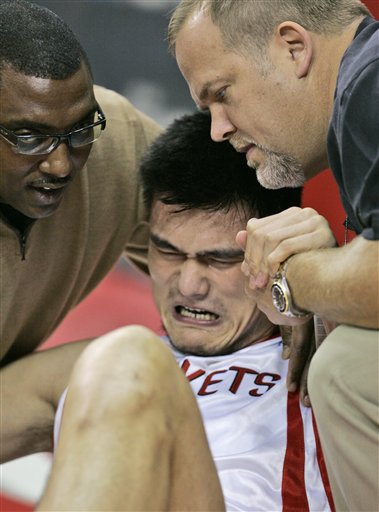 Houston Rockets' Yao Ming (11), of China, reacts as eam physician Dr. Mark