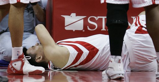Houston Rockets' Yao Ming (11), of China, is lying on floor while screaming