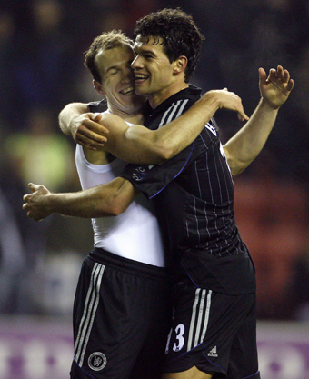Chelsea's goal scorer Arjen Robben (L) celebrates with Michael Ballack (R)