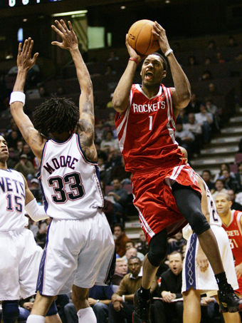 Houston Rockets forward Tracy McGrady (R) drives for a shot past New Jersey