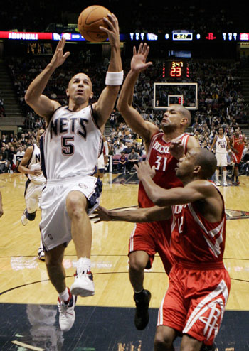 New Jersey Nets guard Jason Kidd (L) drives to the basket past Houston Rockets forward Shane Battier (back R) and guard Rafer Alston (front R) during the first quarter of their NBA game in East Rutherford, New Jersey, December 27, 2006. The Rockets won 96-71[Reuters]