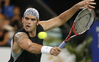 a shot during his men's singles match against Dmitry Tursunov of Russia in