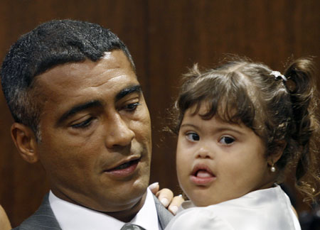 Brazilian soccer star Romario Faria (L) attends a ceremony in Congress with his daughter Ivy as part of the commemoration of World Down Syndrome Day, in Brasilia, March 21, 2007. [Reuters] ![]()
