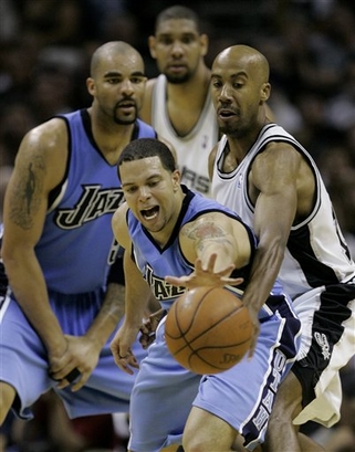 Playing only 39 hours after ending a rough and tumble series with Phoenix and facing a team they could've taken lightly, the Spurs zoomed to a 19-point lead before halftime and were still ahead by 18 early in the fourth quarter. Then a combination of fatigue and Utah's Deron Williams turned things interesting in the final minutes. Although the Jazz never got closer than seven points, and lost for the 17th straight time in San Antonio, Utah's late rally certainly got the Spurs' attention, as did Williams' career-high 34 points.