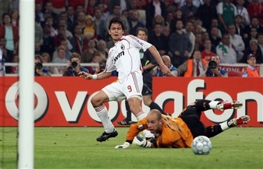 ATHENS, Greece - AC Milan made sure there was no Liverpool comeback this time. The Italian club won the Champions League final Wednesday, defeating Liverpool 2-1 behind two goals by Filippo Inzaghi for its seventh European Cup title. "These are the evenings that remain with you for all your life," Inzaghi said. "I've scored quite a few times in Europe but scoring in the Champions League final is something special." The game was a a rematch of the 2005 final when Milan blew a 3-0 halftime lead and lost on penalty kicks after a 3-3 tie that become one of the greatest finals in the competition's 52-year history. "The defeat two years ago will stay me for a lifetime," Milan midfielder Gennaro Gattuso said. "But this is a different story. It's our turn to celebrate now." Milan moved within two of Real Madrid's record of nine European Cup triumphs. Liverpool has won five times. Milan, whose previous title came in 2003, won a showdown between teams struggling in their leagues — Milan is fourth in Serie A and Liverpool is third in the Premier League. The sea of red of Liverpool fans at one end of the stadium outnumbered the red and black of Milan at the other. Milan went ahead when Andrea Pirlo's 45th-minute free kick went through the wall and deflected off the side of Inzaghi and past goalkeeper Pepe Reina. Inzaghi made it 2-0 in the 82nd, taking a pass from Kaka in the center, spurting ahead and rolling the ball from an angle past the outstretched Reina. "The first goal opened up the game, but the second was certainly more beautiful," Inzaghi said. Dirk Kuyt scored for Liverpool with a minute to go. This time, however, there was no extra time and no penalty shootout. "It's the complete opposite," said Liverpool captain Steven Gerrard, whose goal began the comeback in Turkey two years ago. "You've got to take it on the chin, move on and try to pick yourself up, but at the moment it's heartbreaking. We gave everything but it wasn't to be tonight." Liverpool manager Rafa Benitez, who also led Valencia to the UEFA Cup title in 2004 before moving to Anfield, rued the deflected goal. "We lost against a good team with top-class players," he said. "The first half we played really well but conceded a goal, a deflection, through bad luck." AC Milan nearly was kicked out of this year's competition by European soccer's governing body but was allowed to remain and started in the third round of qualifying. AC Milan captain Paolo Maldini, a month short of his 39th birthday, became the oldest nongoalkeeper to take part in a final. He collected his fifth winners' medal, one short of the competition record by Real Madrid's Francisco Gento. Milan coach Carlo Ancelotti now has two winners medals as a coach to go with the ones he won as a Milan player in 1989 and 1990. "This joy has to be shared with all those close to the club, all those who have sustained us, and all the fans," Ancelotti said. "It was a very difficult game, much like our season. We started slowly but grew in confidence as the game went on. |