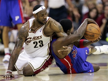 "You are representing the Eastern Conference," the Boston Celtics great said. "Make me proud." Gibson, the hero of Game 4 when he scored a season-high 21, drained a pair of 3-pointers in the first 1:14 of the fourth quarter, giving the Cavs a 73-67 lead and forcing the Pistons to call time. "Boobie is a guy with a lot of poise and a lot of heart," Cavs coach Mike Brown said of Gibson during the trophy presentation. "He's a scorer and a shooter. You leave him alone you better watch out, because it's Boobie for 3." It's been 43 years since a Cleveland team captured a major pro sports title. The Browns lost three straight AFC titles to John Elway and the Denver Broncos, and the Indians haven't won a World Series since 1948. The Cavaliers, who joined the league in 1970, now have a shot to end a drought that has spanned generations for Cleveland fans. "Something had to go right for Cleveland sports," James said. A lengthy delay at the start of the second quarter because of a scoreboard malfunction drained most of the energy from the frenzied crowd and prevented the Cavaliers from adding to their six-point lead. Annoyed by the delay, James scored nine points -- all free throws -- in the first half. Officially, he tried just two shots from the field in the first 24 minutes but was fouled on several drives to the basket and got to the line 11 times. Just as he did before Game 3, James arrived at the arena more than 3 1/2 hours before tipoff to get in some extra shooting practice. Wearing one of his popular "Witness" T-shirts, he worked on 3-pointers, free throws and his post-up moves, backing down imaginary Pistons for easy inside baskets. Powerless to stop him in Game 5 on their home court, the Pistons were determined not to allow James to score as he did. They were as loose as always in the locker room before the game, as Wallace blasted some Snoop Doog from a portable stereo and several of his teammates bobbed to the beat.
