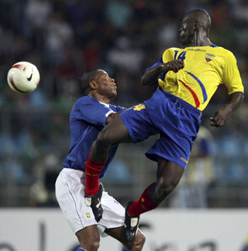 Ecuador's Segundo Castillo (R) heads the ball past Brazil's Julio Baptista in Match 16 of the Copa America soccer tournament in Puerto La Cruz July 4, 2007. Brazil won 1-0 with Robinho's second-half penalty.[Reuters]