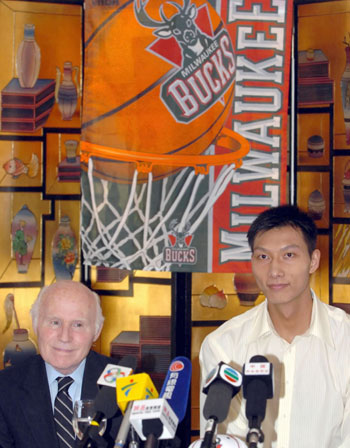 China's NBA draft pick Yi Jianlian (R) and Milwaukee Bucks owner Herb Kohl meet the press during a conference to announce Yi's signing with the NBA franchise in Hong Kong August 29, 2007. Yi signed a three-year deal after a two-month stalemate with the Bucks as he refused to embrace the team after the Draft late in June. [Xinhua] Click for related story |