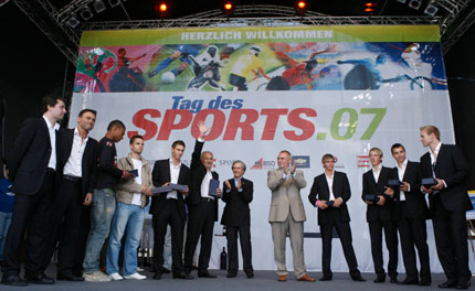 Austrian Football Association (OeFB) President Friedrich Stickler (7th L) and Austrian Chancellor Alfred Gusenbauer (8th L) applaud Austrian U-20 soccer team members during a Euro 2008 promotion day in Vienna September 29, 2007. 'Herzlich willkommen - Tag des Sports' reads 'A hearty welcome - Day of Sports'. [Reuters] |