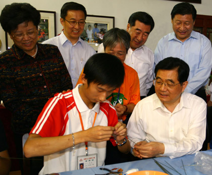 Updated: 2007-10-02 10:30 Shanghai - President Hu Jintao called on the whole society to carry forward humanitarian and traditional virtues and to respect, care and help the disabled population during an inspection tour of Shanghai Monday. Addressing teachers at Sunshine House, a special healthcare and training center established for mentally disabled people in the city's Hongkou District, Hu said the society should respect and thank the teachers as they "bring hope and happiness to the disabled and their families with their love and dedication". The president encouraged the center to help more disabled people to integrate into the society and contribute to social harmony.