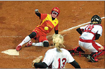Zhang Lifang (L) of China slides to score one of China's five runs in the championship game of the China Cup International softball Tournament at Beijing's Fengtai Softball Field October 14, 2007. [China Daily] |